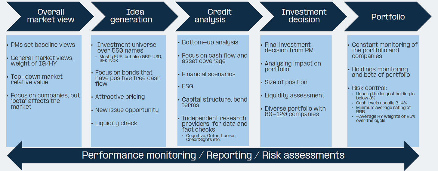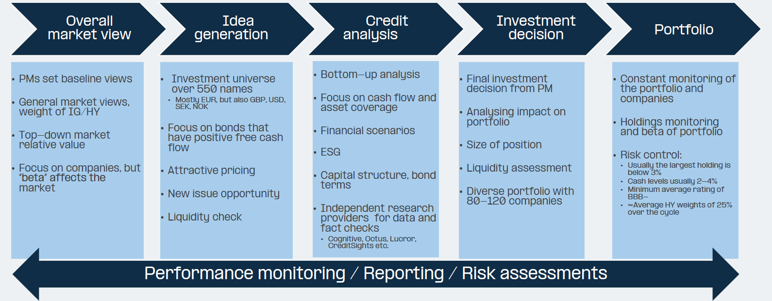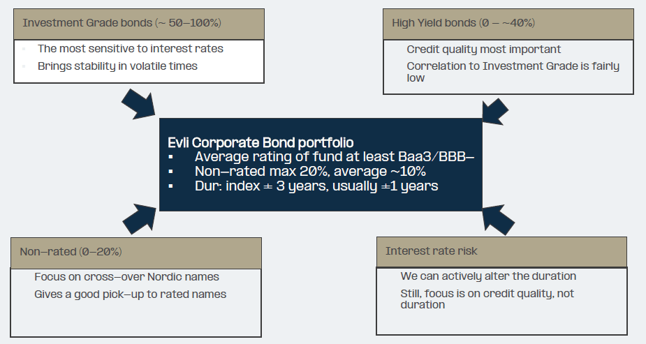 El objetivo primordial del Evli Corporate Bond es lograr una rentabilidad superior, alta y estable en comparación con el mercado de bonos de grado de inversión (IG), utilizando una estrategia crossover. El fondo busca un “yield pickup” sustancial a través de la selección activa en el segmento BBB-/BB.