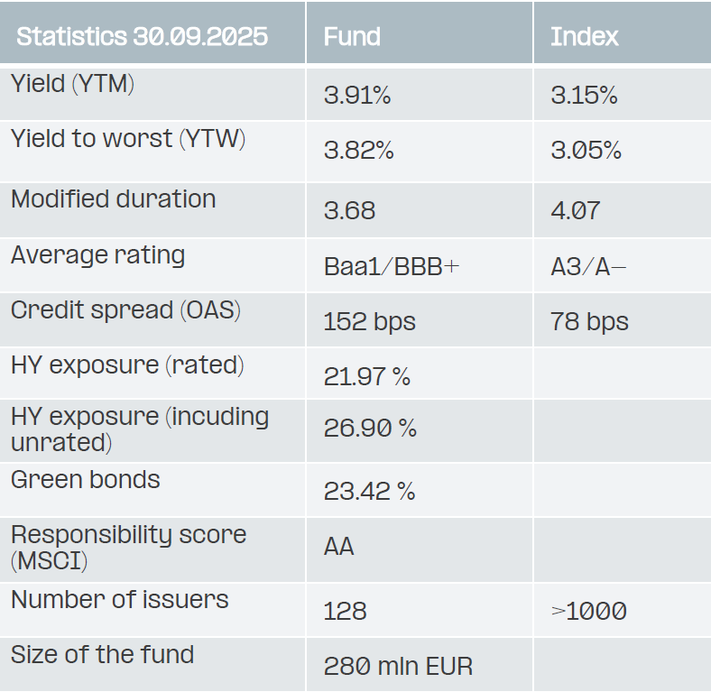 El conjunto de 128 emisores en cartera muestra un YTM del 3.91%, priorizando un alto carry como fuente principal de retorno esperada, junto con una elevada calidad, a efectos de protegerse del riesgo de impago.