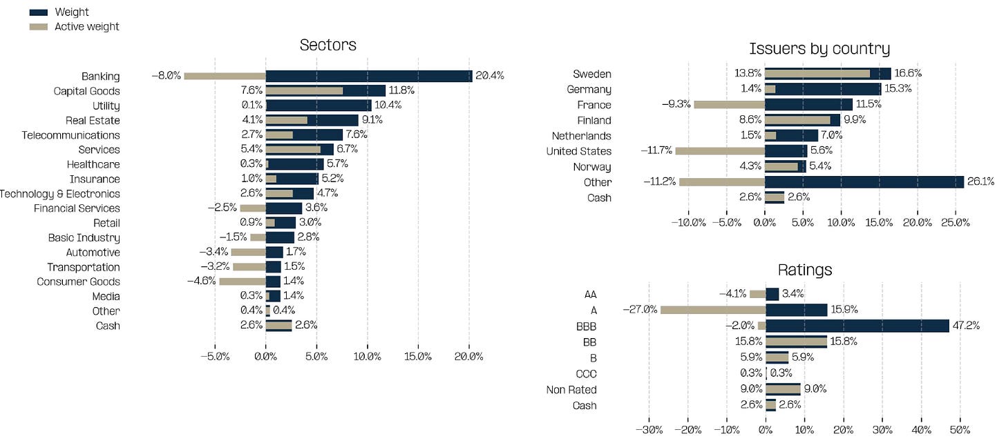 Fruto de ese proceso se presenta una cartera desviada del índice con un marcado sesgo nórdico, infraponderando sectores como el bancario y cubriendo el riesgo cambiario en aquellas emisiones distintas al euro.
